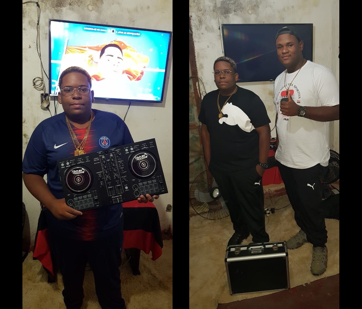 DJ Ramon Sucesso: A gente não tinha uma “case” para a primeira controladora que eu ganhei. Aí tem uma foto da gente indo para um evento que a gente ia fazer de graça, ele segurando a controladora e uma maleta que o meu pai achou na rua quando ele trabalhava, que lá coube meu notebook, só que nessa maleta não coube a controladora, porque a CDJ era muito maior que a maleta. Aí tem uma foto muito engraçada nossa de quando nós começamos. Assim, ó (imita a pose e ri). Acho que é mais essa memória e mais o lava jato.