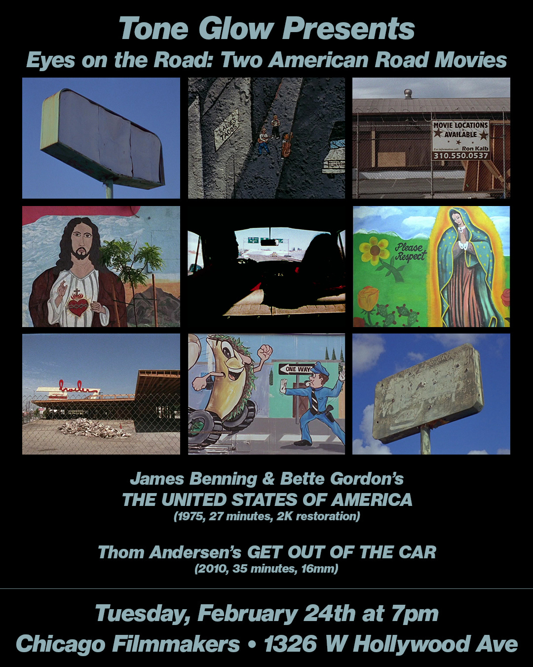 On February 24th at Chicago Filmmakers, Tone Glow presents two structuralist road movies